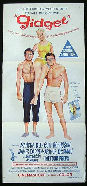 “Gidget” film poster featuring Cliff Robertson, Sandra Dee, James Darren.