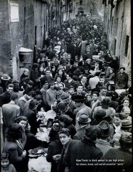 “Rome flocks to the black market to pay high prices for bread, cheese, salt and all-essential pasta” (LIFE/Margaret Bourke-White, Scanned by Comet)