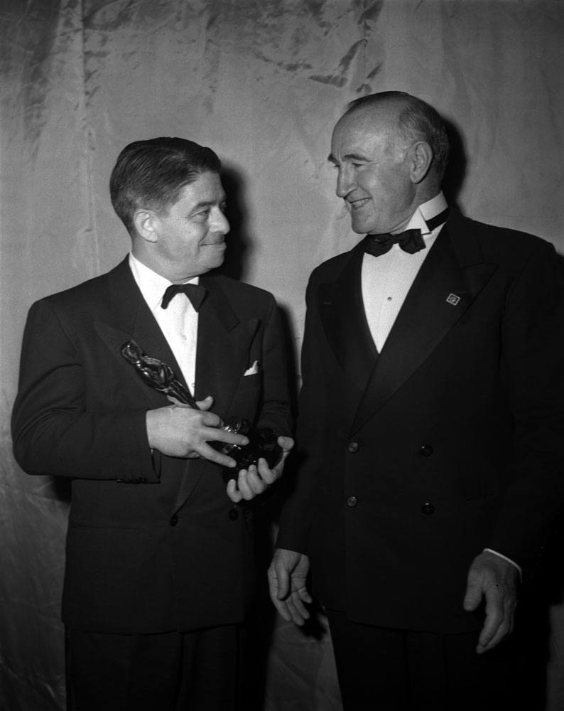 Alfred Newman with Donald Crisp and his Academy Award for “Mother Wore Tights.”