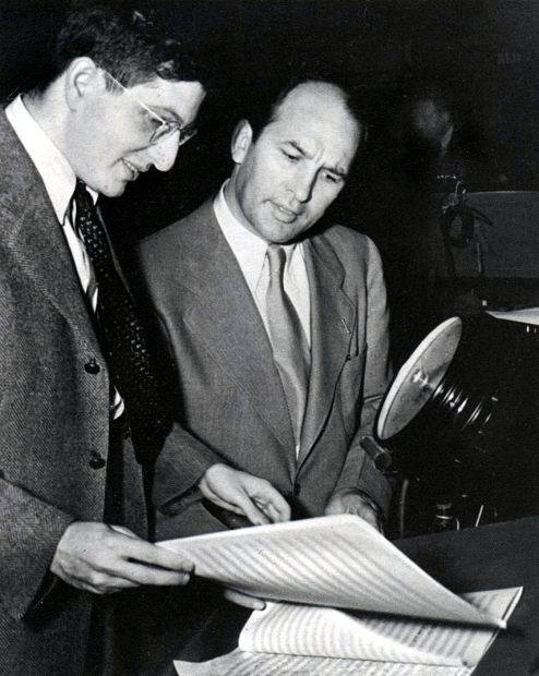 Bernard Herrmann with director William Dieterle looking over the Academy Award winning “All That Money Can Buy” score.