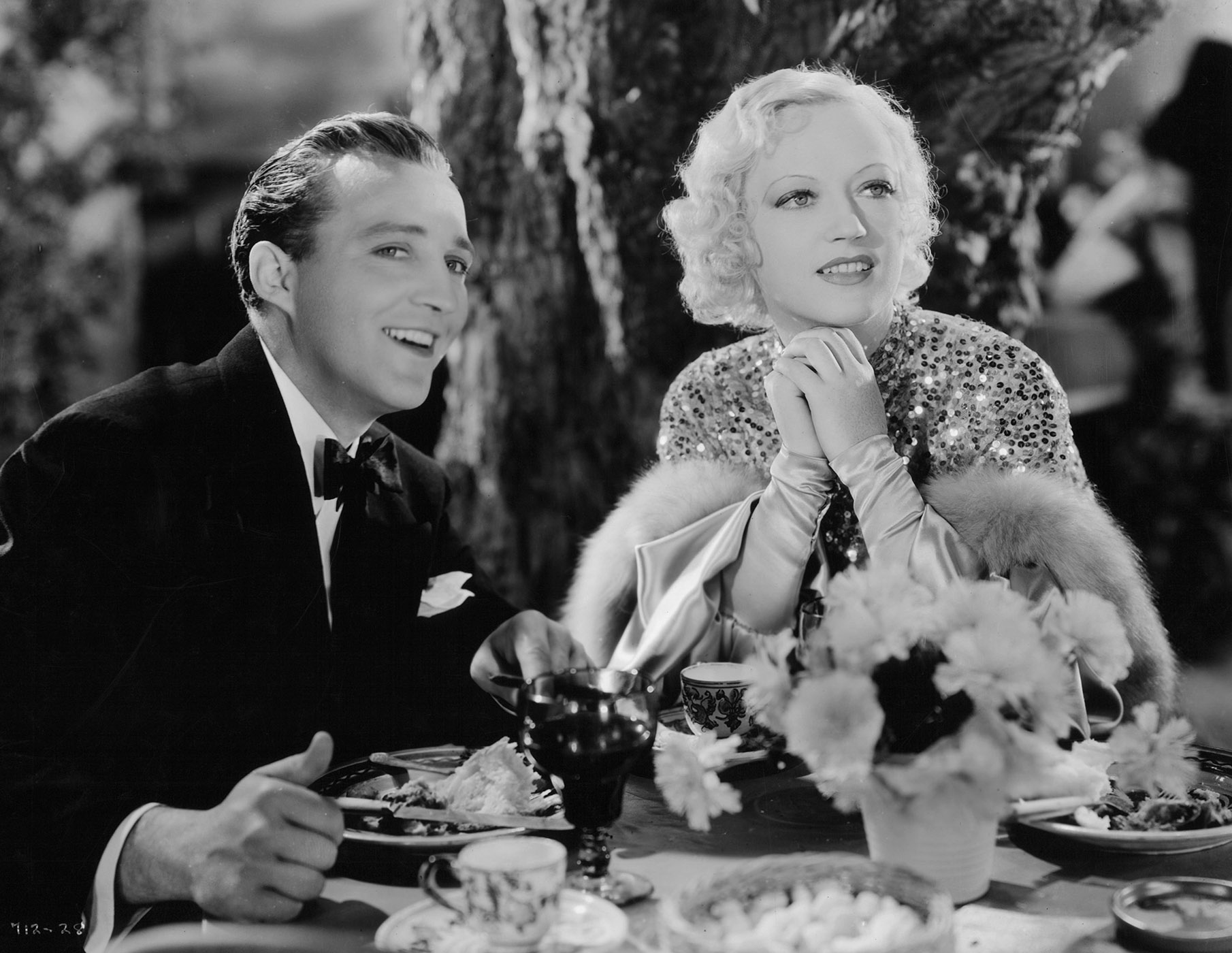Bing Crosby and Marion Davies sit at table in a scene from the film ‘Going Hollywood’, 1933. (Photo by Metro-Goldwyn-Mayer/Getty Images)