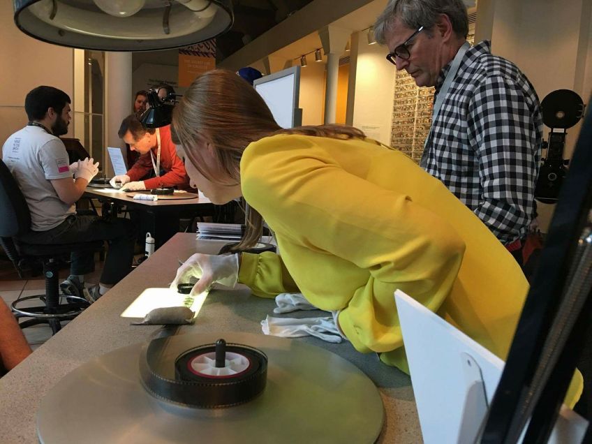 Looking at a strip of Nitrate Film with a 1945 Red Cross promotional film with Ingrid Bergman.