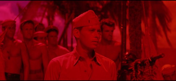 Filmed in lush, beautiful Hawaii, a yellow, blue or red filter appears during a song or scene distorting the whole feel of the moment. For example, we finally arrive in Bali Ha’i, after hearing about this mystical island the whole film, and it’s all in red. The idea came from a suggestion by David Zeitlin in a memo to Logan, saying that he and colleagues wanted to give a surreal effect to songs and use the color to highlight specific parts of different songs, according to Block’s book. Cinematographer Leon Shamroy told Logan it would be subtle, but Logan felt the color was too blatant. I feel that the colored filters really takes the viewer out of the film and distorts the image too much.