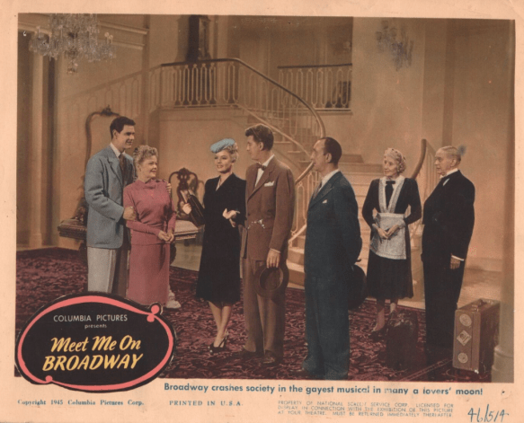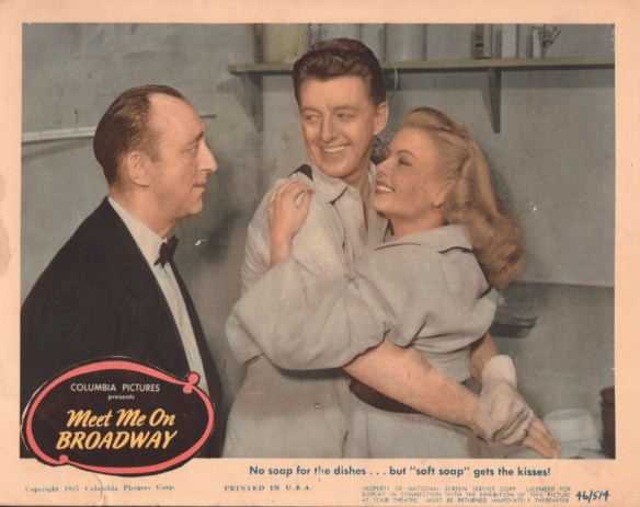 Before seeing “Meet Me on Broadway,” I had never heard of actor Frederick Brady, who is billed as Fred Brady. Primarily a writer, Brady was in 13 films between 1943 and 1950. Of his filmography, I had only seen Stage Door Canteen (1943), Swing Shift Maisie (1943) and An American Romance (1944). That said, though Brady is the star of this film, he has entirely too much screentime and isn’t a favorite.