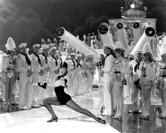 For Eleanor Powell, “Born to Dance” was only her third credited role and second with MGM, with “Broadway Melody of 1936” as her first film under contract with the studio. Not only does Powell dance in this film, but also “sings.” Powell’s singing is dubbed by Marjorie Lane, who’s singing voice matches Powell’s speaking voice fairly well. Lane also dubbed Powell in other films. Powell performs what is probably one of her most famous dance numbers in “Born to Dance” – “Swingin’ the Jinx Away.” The enormous finale includes Powell dressed in a sequined leotard with a Navy flare with giant cannons and a battleship as her background. I feel that this film best shows off not only Powell’s tap dance abilities but her training as a ballet dancer, as she combines the two dance types in several of her numbers.