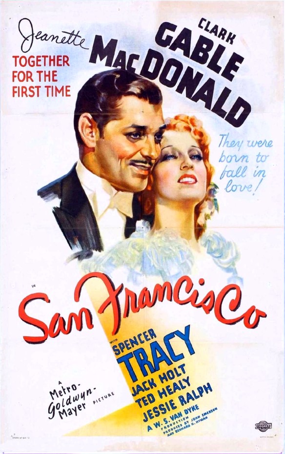 In the film, Blackie Norton (Clark Gable) is a brash saloon owner of the Paradise, who also is running for San Francisco Board of Supervisors. After her tenement apartment burns down, Mary Blake (Jeanette MacDonald) seeks out work at the Paradise. After earning the job, impresario and wealthy Jack Burley (Holt) of Tivoli Opera House hear Mary sing and want her to perform with them, but Blackie is reluctant to let her contract go. Along the way, Blackie’s childhood friend, Father Tim Mullin (Tracy) butt heads over Blackie’s dealings around town, though Blackie continues to help Father Mullin.