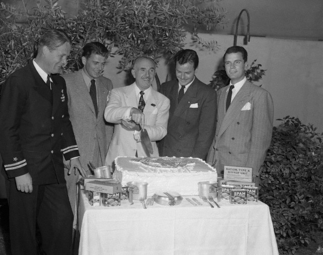 Jack Warner welcoming actors home from the war in 1945 including Wayne Morris, Ronald Reagan, Army Air Forces; Jack Warner; Gig Young, Coast Guard; and Harry Lewis, Army.
