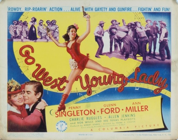 The B-budget film stars Penny Singleton, Glenn Ford and Ann Miller. Today, Ford and Miller are the big names of this film, but in 1941, Singleton was more famous than her co-stars. At this point in time, Singleton was knee-deep performing in “Blondie” movies. Singleton had starred in nine Blondie films by the time “Go West, Young Lady” was released in 1941, and this was the only none-Blondie role she starred in from 1938 to 1946.