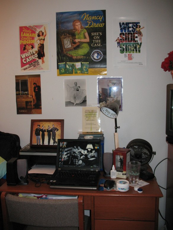 My desk area with Nancy Drew, White Cargo, West Side Story posters on top and Brandon Flowers, Betty Grable and Doris Day below. Also on the desk is a "White Christmas" photo, Robert Osborne bobble head and my desk top background is from "Since You Went Away"