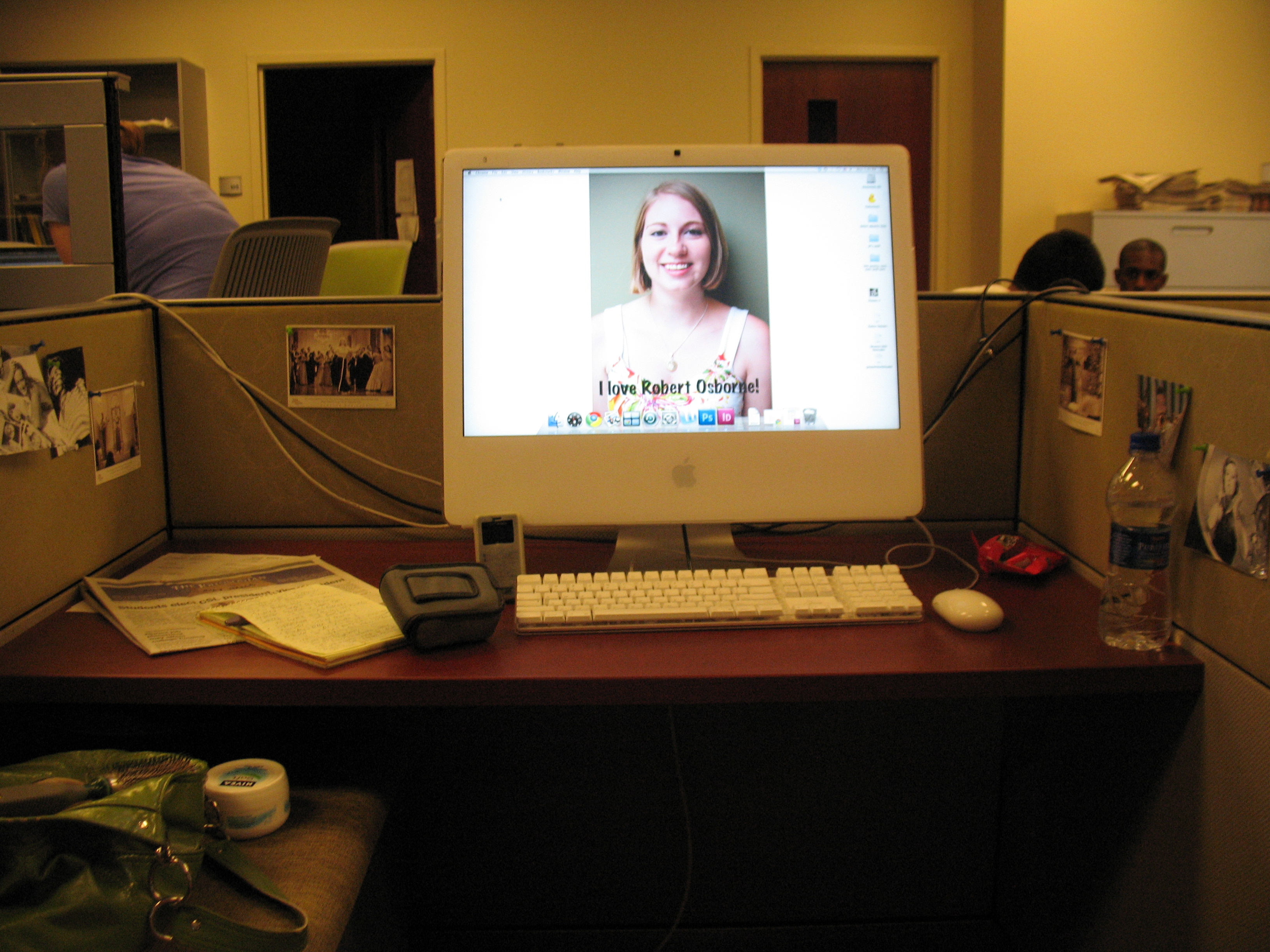 My desk. Thats me on the desk top background with "I love Robert Osborne" written on the photo. As a joke each editor had their mug shot set as the background and something that defined them written about themselves.