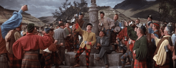 And then I revisited “Brigadoon” for the first time in 14 years yesterday to prepare for this musical post. It starts off with sweeping, beautiful notes and with flaming red title cards. The painted studio scenery is the backdrop for as low voices sing about lost hunters and Brigadoon. Then a flourish of Scotish townspeople rush across the screen dressed in vibrant Irene Sharaff costumes. The first few numbers are exuberant and a bit wistful (“Waiting For My Dearie”). As I watched, I found myself enjoying the film, but kept preparing myself, “Something is going to irritate me or is this is going to go south.”