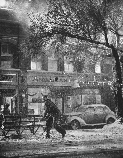 Capra has some great camera shots. Most of my favorites were toward the end when George Bailey (Jimmy Stewart) hasn’t been born such as when childhood friend and local hussy Violet (Gloria Graham) is being arrested- the camera is in her face as she is struggling with the cops. Another shot is the close up of George Bailey’s face as he is frantically looking around Pottersville/Bedford Falls. Other shots I liked were at the graduation dance with the close up on Mary (Donna Reed) when George first sees her after many years and ( also at the graduation dance) when the two boys (one being Carl ‘Alfalfa’ Schwartz) are planning to open the swimming pool floor.
