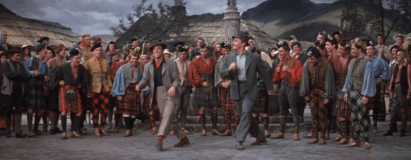 And then I revisited “Brigadoon” for the first time in 14 years yesterday to prepare for this musical post. It starts off with sweeping, beautiful notes and with flaming red title cards. The painted studio scenery is the backdrop for as low voices sing about lost hunters and Brigadoon. Then a flourish of Scotish townspeople rush across the screen dressed in vibrant Irene Sharaff costumes. The first few numbers are exuberant and a bit wistful (“Waiting For My Dearie”). As I watched, I found myself enjoying the film, but kept preparing myself, “Something is going to irritate me or is this is going to go south.”