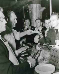 John Wayne also helped carve turkeys. Ward Bond was also going to carve turkeys, but got too inebriated that night before, according to the book Three Bad Men: John Ford, John Wayne, Ward Bond by Scott Allen Nollen.