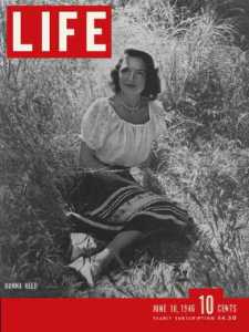Jane Powell can be seen wearing this style in wore a in “Luxury Liner” (1948). The July 17, 1944, LIFE magazine cover features a model wearing what was known as the “Peasant Clothes.” She is wearing a lose, capped sleeve blouse, a flared striped skirt and wedged hemp shoes.