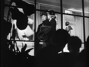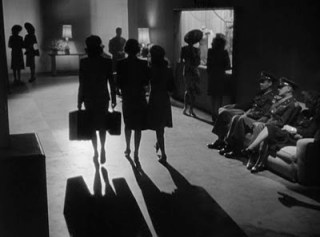 Camera technique: I feel some of the camera techniques in this film might compete with Hitchcock. The director took advantage of light and shadows. One example of this is Bill and Jane sitting on the Hilton’s back porch talking. The two are back-lit so we only see their silhouettes. The only light from the couple is when Bill lights his cigarette. Another is when Jane is saying goodbye to Bill at the train station. She stands there waving goodbye, the camera pulls back and her shadow stretches about 100 feet across the station. Another shot I really like is when Guy Madison leaves Jane and Bill after they walk around downtown. He gets on the bus and walks to the back, but the camera stays on him as he walks and the bus is driving away to the left and going off screen. But some of my shots are during the dance at the canteen.  One part is the shadows as couples waltz (seen at 2:05 in the video below). Also right after they find out Johnny Mahoney dies, there is a shot through a star emblem and you see everyone dancing in the background, very beautiful.
